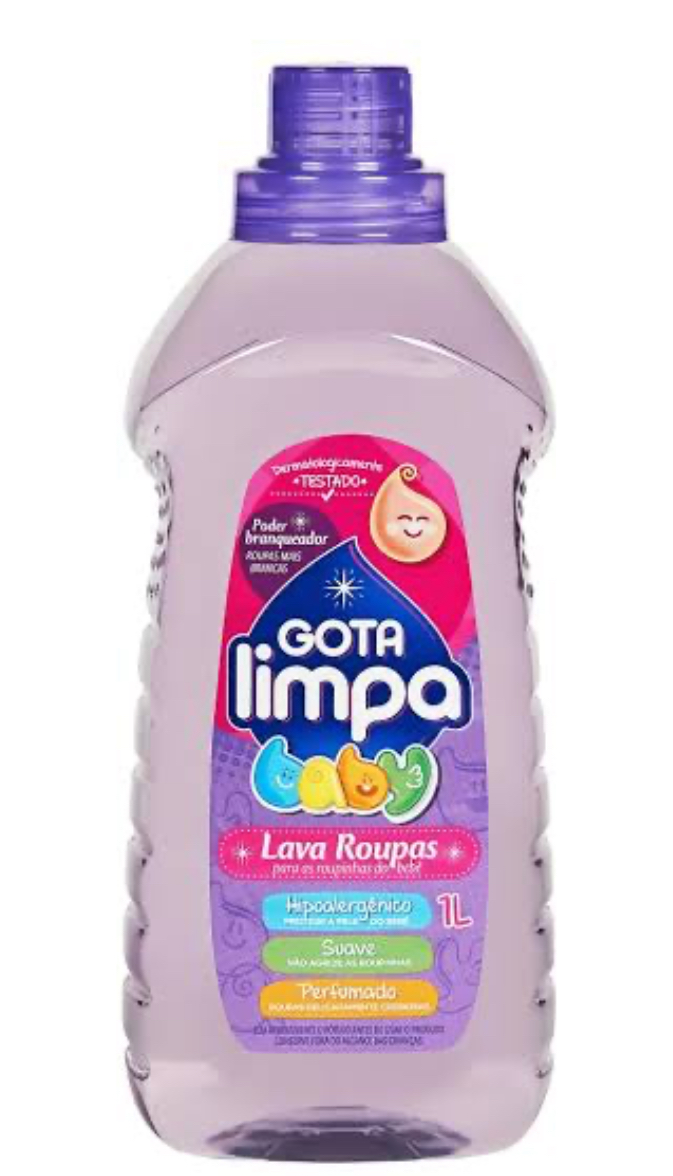 O produto na imagem é o lava roupas líquido Gota Limpa Baby, especificamente formulado para o cuidado com as vestimentas de bebês e recém-nascidos, que exigem uma limpeza mais delicada e segura.